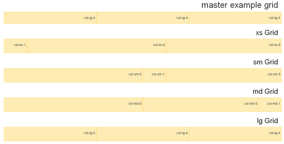 این فریمورک به طور پیشفرض صفحه را به صورت عرضی به 12 قسمت تقسیم می کند که می توانید برای قالب بندی خود از این گرید به صورت customized شده استفاده کنید. برای روشن شدن موضوع به طور مثال فرض کنید شما صفحه ای دارید که شامل سه ستون است با استفاده از این فریمورک می توانید به راحتی صفحه ی خود را با استفاده از کلاس های کمکی که در این فریمورک تعریف شده است برای دستگاههای مختلف طراحی کنید. سیستم گرید بوت استرپ شامل کلاس های کلی زیر است که برای دستگاههای مختلف در نظر گرفته شده است .