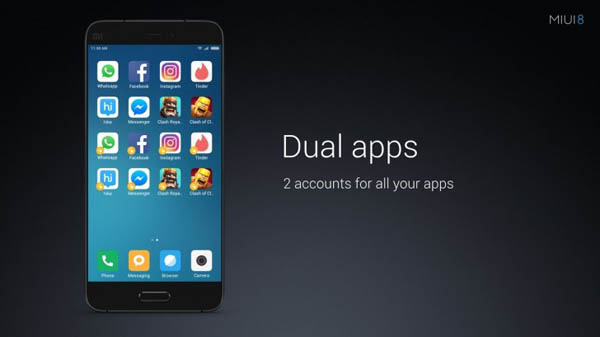 به راستی که Dual Apps بهترین ویژگی MIUI 8 است. کاربران با استفاده از این ویژگی میتوانند هر اپلیکیشنی را که میخواهند، دو بار روی گوشی خود نصب کنند. مثلا شما میتوانید دو اپلیکیشن واتساپ، دو تلگرام یا دو بازی کلش او کلنز داشته باشید و بدون هیچ هک و ترفندی، با دو شماره یا اکانت مختلف از آنها استفاده کنید.