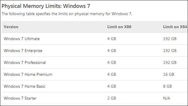 به عنوان مثال ، اگر از Windows 7 Starter استفاده می کنید ، می توانید فقط تا 2 گیگابایت رم استفاده کنید ، نه 4 گیگابایت. کاربران Windows Home Basic فقط می توانند حداکثر 8 گیگابایت حافظه رم استفاده کنند ، حتی اگر از نسخه 64 بیتی ویندوز استفاده کنند.