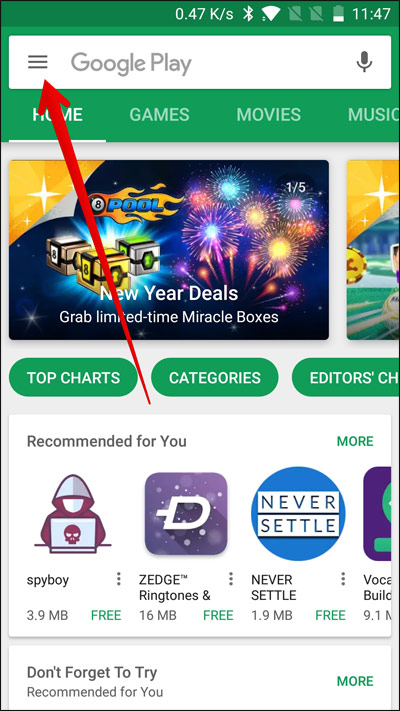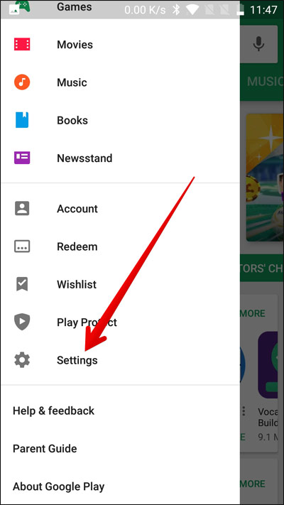 به منوی Play Store در Android. بروید و به تنظیمات بروید.