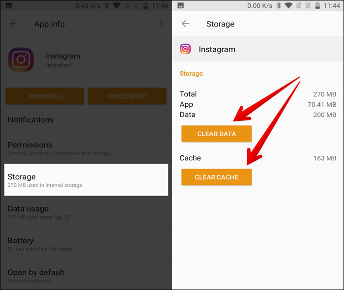 باید حافظه پنهان و داده های برنامه اینستاگرام را مانند تصویر زیر پاک کنید: