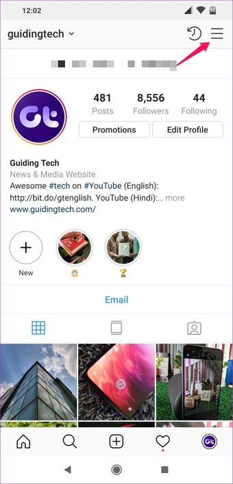 مرحله 1: به حساب پروفایل در حساب Instagram خود بروید و بر روی دکمه منو در گوشه بالا سمت راست ضربه بزنید.