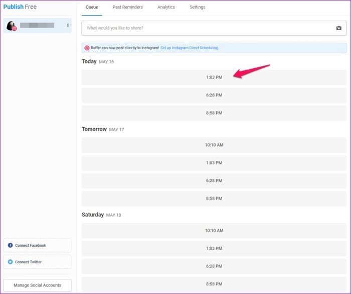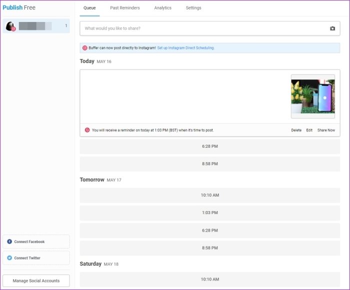 بنا بر این اگر از این ویژگی برای انتشار چندین تصویر در یک پست واحد ، عکس هایی با نسبت ابعاد مختلف استفاده می کنید یا سعی در انتشار یک حساب شخصی دارید ، بافر مستقیماً پست ها را منتشر نمی کند.درعوض ، یادآوری در تاریخ و ساعت معین را برای شما ارسال می کند.