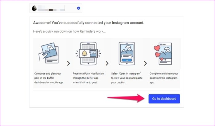 مرحله 5: پس از پیوند دادن اکانت اینستاگرام خود ، به داشبورد کاربری خود بروید و گزینه Go to dashboard را بزنید.