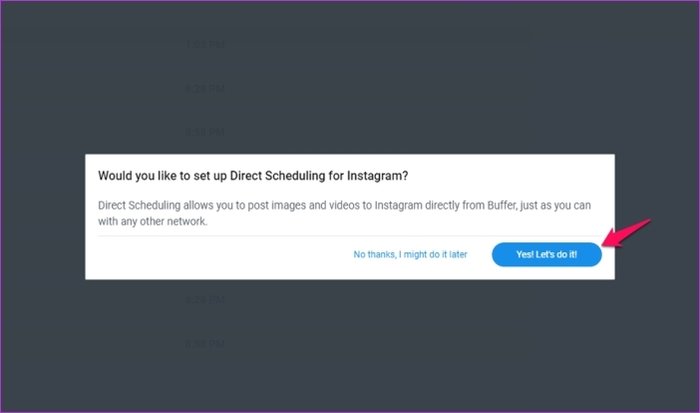 مرحله 6: در مرحله بعدی ، شما باید Direct Scheduling را تنظیم کنید تا بافر بتواند به صورت خودکار از طرف شما پست ارسال کند.فقط در صفحه وب زیر روی Yes کلیک کنید و به صفحه تأیید اعتبار Facebook هدایت می شوید.
