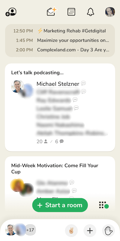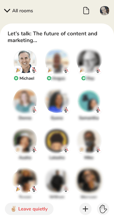 وقتی در حال پایین رفتن از راهرو کلاب هاوس هستید، میتوانید منظرهای از یک اتاق را با یک نگاه مشاهده کنید، برای مثال نام اتاق، برخی از افراد حاضر در اتاق و تعداد بلندگوهای فعال اتاق را میبینید؛ این اتاقها عمومی هستند و هر کسی می تواند در هر زمان به هر کدام از آنها بپیوندد. حتی میتوانید با یک یا چند اتصال خود یک اتاق خصوصی راهاندازی کنید و یک گپ خصوصی داشته باشید.
