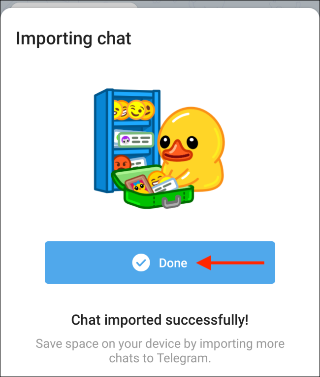 سپس برنامه تلگرام شروع به وارد کردن چت شما می‌کند. پس از پایان این کار‌، شما دستورالعمل "تکمیل" را مشاهده خواهید کرد که باید روی گزینه‌ی "انجام شد" ضربه بزنید.