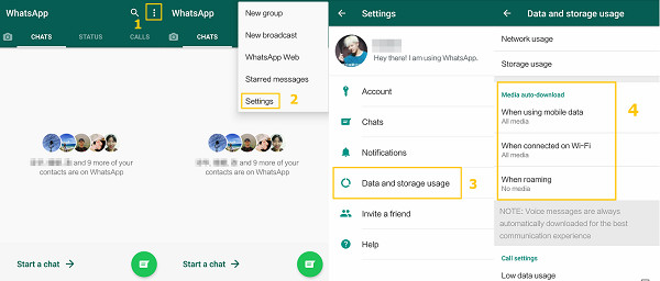 در گوشیهایی که با سیستمعامل اندروید کار میکنند، واتساپ را باز کنید و به پنجره مکالمات بروید. بالای صفحه، سمت راست، سهنقطه عمودی تنظیمات را انتخاب کنید. به قسمت دانلود خودکار داده یا “Media Auto-Download” بروید. در اینجا با سه گزینه مواجه میشوید که به معنای دانلود عکس و فیلم هنگام استفاده از اینترنت موبایل، هنگام اتصال به وایفای یا هنگام رومینگ هست. اگر هر سه گزینه را برای تصویر، ویدئو و صوت غیرفعال کنید دیگر هیچ اطلاعاتی از واتساپ خودبهخود روی موبایل شما ذخیره نمیشود.