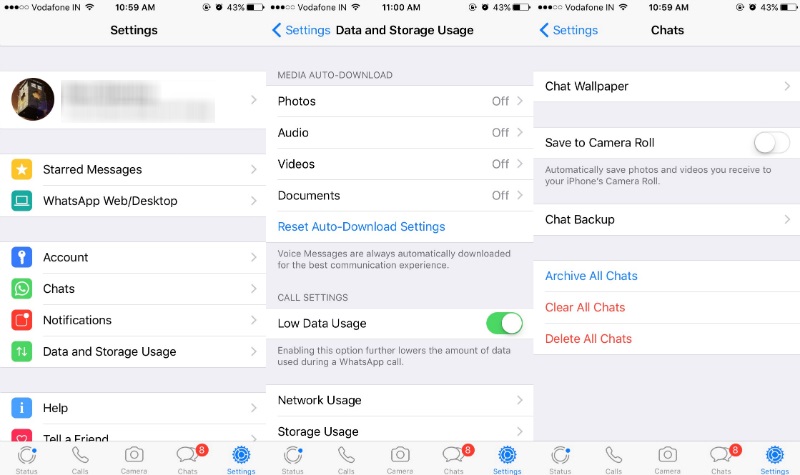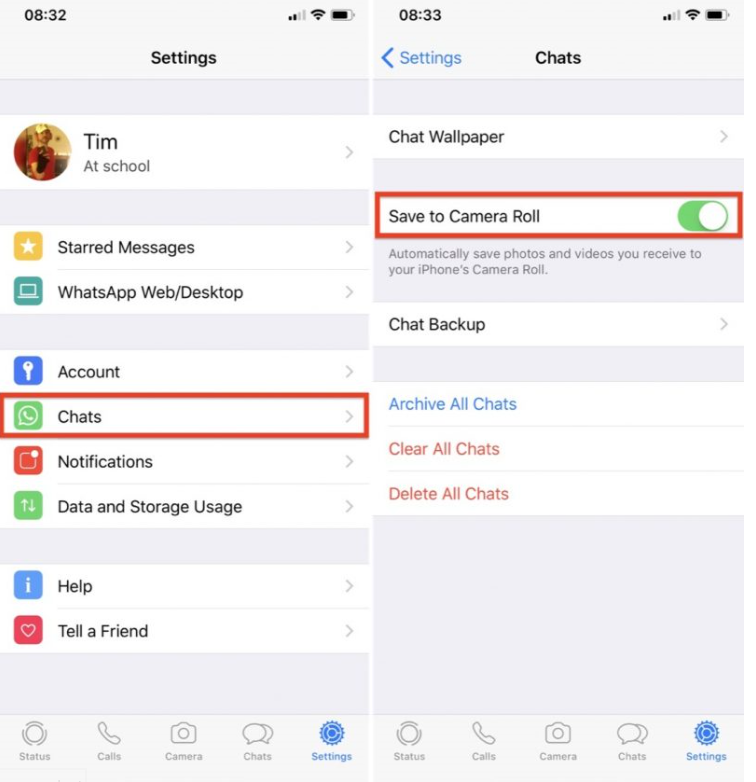اگر از گوشیهای آیفون استفاده میکنید در "Camera Roll" امکان جلوگیری از ذخیره و نمایش عکس و فیلم های واتساپ در گالری را برای شما فراهم میکند. به این منظور واتساپ را روی آیفون یا آیپد خود باز کنید. آیکون تنظیمات یا “setting” را لمس کنید. وارد قسمت مکالمات یا “chats” شوید. در این قسمت، در حالت پیشفرض گزینه ذخیره مدیای دریافت شده یا “save incoming data” فعال است. با غیرفعالکردن این گزینه دیگر عکسها یا ویدئوهایی که در واتساپ برای شما ارسال میشود روی گالری ذخیره نمیشود.