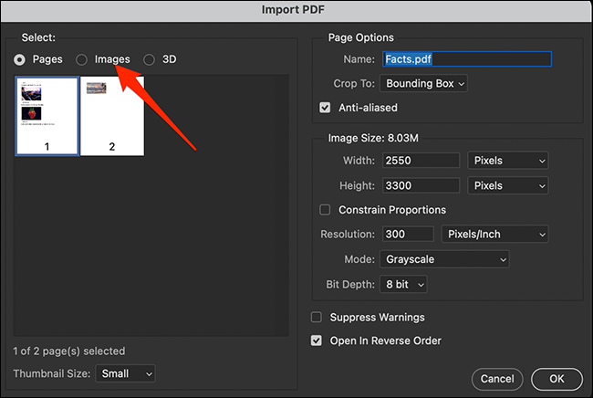 اکنون پنجره ی Import PDF فتوشاپ باز می شود. در این مرحله بر روی Images در قسمت بالای پنجره کلیک کنید تا تمامی تصاویر موجود در فایل PDF انتخابی را ببینید.