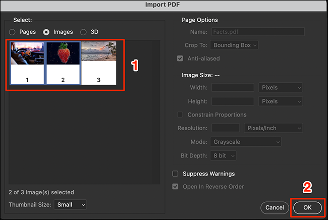فتوشاپ، تمامی تصاویر موجود در فایل  PDF را به شما نشان خواهد داد. برای استخراج تصاویر مورد نظر خود از میان همه ی تصاویری که نشان داده می شود، بر روی آن ها کلیک کنید. برای انتخاب چندین تصویر، Shift را نگه داشته و بعد روی هر تصویر کلیک کنید. بعد از انتخاب تصاویر مورد نظر خود، روی OK در پایین پنجره کلیک کنید.