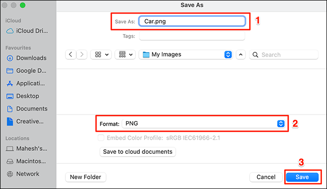در مرحله ی بعدی، پنجره ی Save As فتوشاپ ظاهر می شود. در قسمت بالای این پنجره، بر روی Save As کلیک کرده و نامی برای فایل تصویر خود انتخاب کنید. سپس روی Format در قسمت پایین پنجره کلیک کرده و فرمت مورد نظر خود را برای تصویر انتخاب کنید. در نهایت روی Save در پایین ترین قسمت پنجره کلیک کنید. این مراحل باید برای تمامی تصاویر انجام شود. در مورد فرمت تصاویر اگر مطمئن نیستید که جه چیزی انتخاب کنید، پیشنهاد می کنیم فرمت PNG را انتخاب کنید.