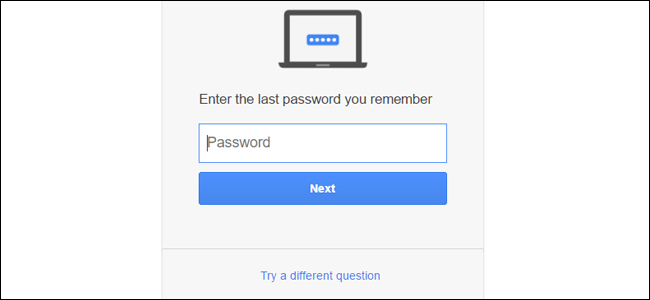 سپس به شما نشان داده می شود که آخرین رمز عبوری را که می توانید به خاطر بیاورید را وارد کنید. اگر بتوانید رمز درست را به یاد بیاورید و یک سیستم پشتیبان ایجاد کنید، از شما درخواست می شود که به روش های مختلفی ادامه دهید. اگر نمی توانید هیچ یک از آن ها را به یاد بیاورید، "try a different question - یک سوال متفاوت" را کلیک کنید.