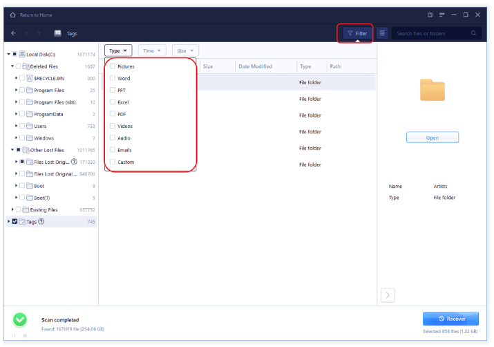 سپس میتوانید یکی از انواع دستهبندیها را انتخابکرده و به جستوجوی فایل موردنظر خود بپردازید. پس از یافتن فایل حذفشده، با استفاده از گزینه Recover میتوانید آن را بازیابی و ذخیره نمایید.