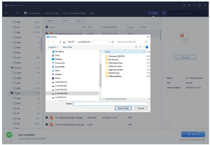 در مرحله دوم، پس از کاملشدن اسکن، امکان مشاهده پیشنمایشی از فایلها برای شما فراهم میشود. همچنین دستهبندی و امکان فیلترکردن فایلها به شما کمک میکند که با سرعت بیشتری به فایل از دسترفته خود در میان فایلهای ویدیویی، صوتی، تصویری یا اسناد دست پیدا کنید.