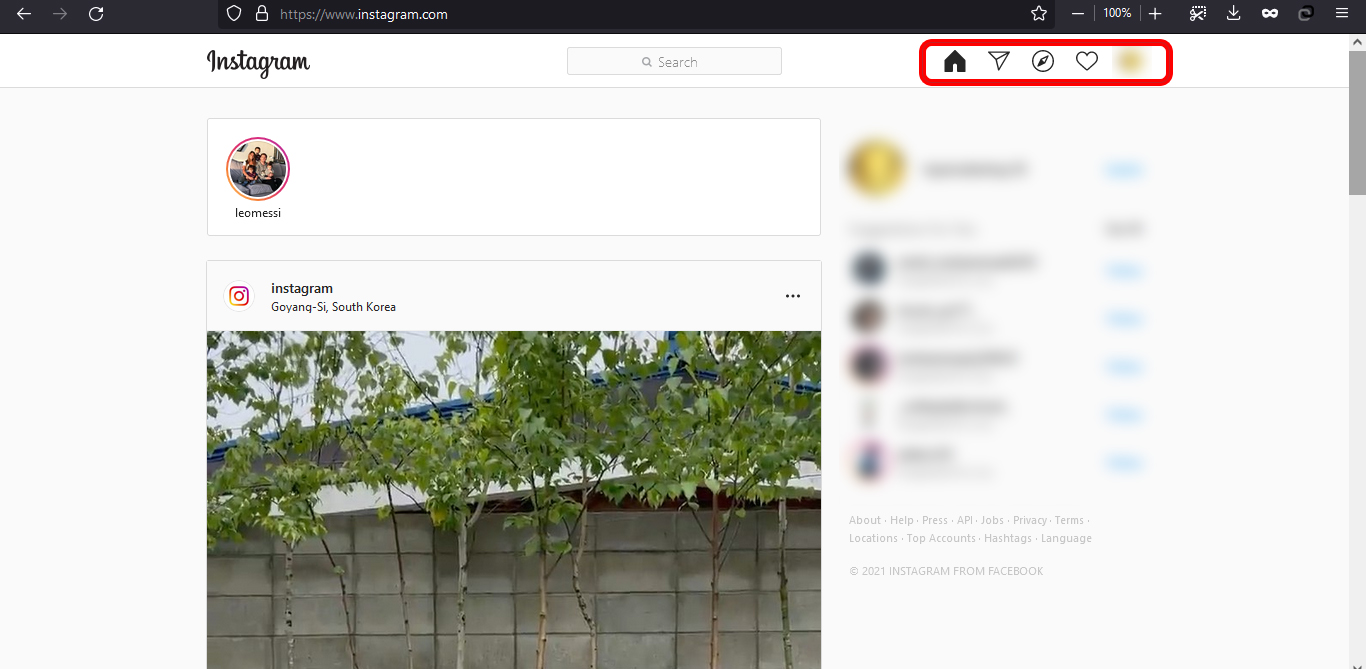 بعد از اینکه توانستید با موفقیت وارد شوید، میتوانید مانند گوشی به بخشهای مختلف اینستاگرام از طریق نوار بالا مطابق تصویر زیر دسترسی داشته باشید.