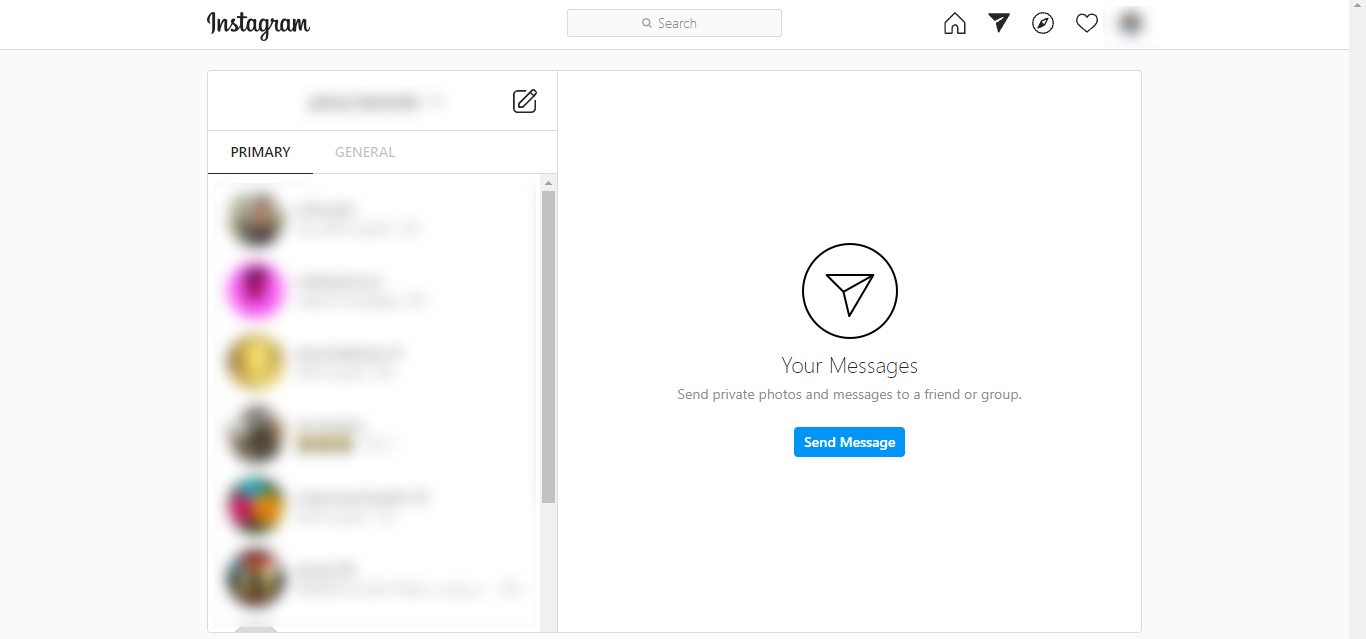 در این بخش بهراحتی به تمام دایرکتهای شخصی خود دسترسی دارید و میتوانید با کلیک کردن روی هرکدام از آن ها، وارد چت شخصی خود شوید. همچنین با کلیک روی دکمه آبیرنگ send message در سمت راست و پیدا کردن پیج فرد مورد نظر، میتوانید گفتگوی جدیدی را در دایرکت شروع کنید.