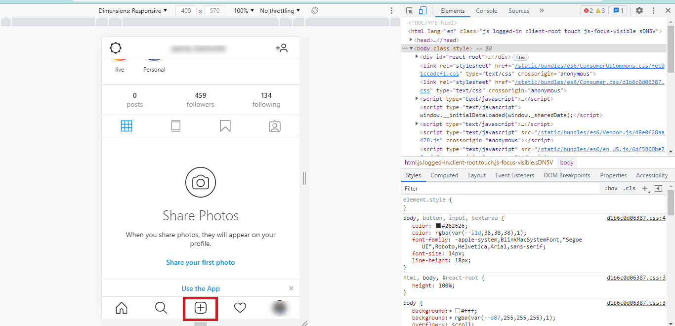 یعنی اگر با کروم یا فایرفاکس هستید، روی صفحه کلیک راست کنید، گزینه inspect را انتخاب کنید و بعد علامت موبایل مانندی که برایتان ظاهر میشود را انتخاب کنید. به اینترتیب خیلی راحت اینستاگرام وب تبدیل به نسخه شبیهسازی شده اینستاگرام موبایل میشود و میتوانید پست را به روش معمول آپلود کنید. یعنی روی گزینه + مطابق تصویر زیر که دور آن کادر قرمز کشیده شده بزنید و شروع به آپلود پست کنید.