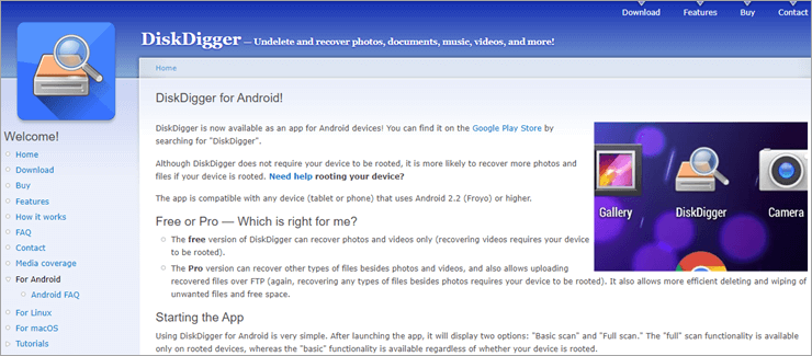 نرم افزار DiskDiggerهر دو حالت اسکن« اولیه» و «کامل» را برای بازیابی اطلاعات در اختیار شما قرار میدهد. حالت اسکن کامل فقط برای دستگاههای اندروید روت شده در دسترس قرار دارد. نسخه اصلی و پولی این نرمافزار از هر دو دستگاههای روت شده و روت نشده پشتیبانی میکند.