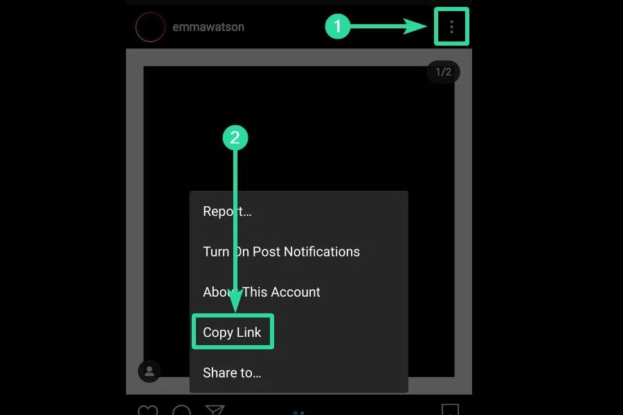 اولین روش کپی کپشن اینستاگرام، استفاده از مرورگر در تلفن همراه است. برای کپی کردن کپشن، کامنتها، بیوها و موارد دیگر از اینستاگرام، میتوانید از مرورگرهایی مانند کروم و موزیلا فایرفاکس، در تلفنهای همراه با سیستم عاملهای اندروید و آی او اس (iOS) استفاده کنید. برای این روش، ابتدا باید پست مورد نظر خود را در برنامه اینستاگرام باز کنید. سپس علامت سه نقطه قسمت بالا و سمت راست پست را لمس کرده و روی عبارت Copy Link(کپی کردن لینک) کلیک کنید.