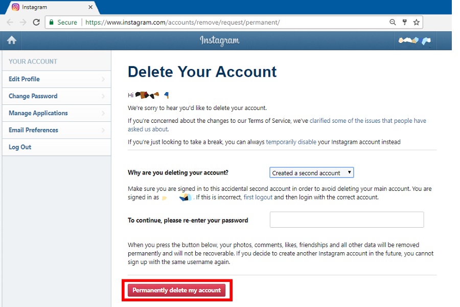 دیلیت اکانت اینستاگرام از طریق وبسایت اینستاگرام