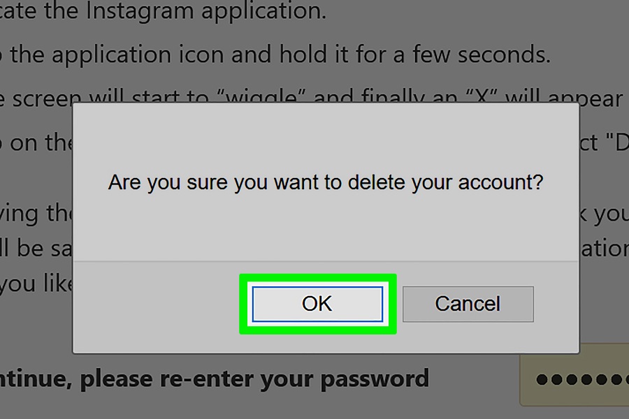 - بعد از پر کردن فیلدهای مذکور، باید گزینه delete my account را بزنید تا فرآیند دیلیت اکانت دائمی اینستاگرام شروع شود. در این مرحله، اینستاگرام برای حصول اطمینان از شما سوال میپرسد که در صورت مطمئن بودن در خصوص حذف اکانت اینستاگرام، باید گزینه OK را انتخاب کنید