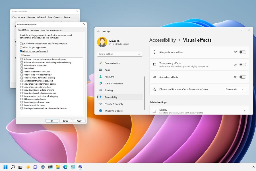پس از آن پنجرهای برای شما باز میشود. در این پنجره، گزینه Adjust for best performance را انتخاب کرده و روی OK و Apply کلیک کنید تا تغییرات مورد نظرتان اعمال و ذخیره شوند. همچنین میتوان با انتخاب گزینه Custom از لیستی که ارائه شده، جلوههای بصری خاص مدنظر را بهصورت شخصیسازی شده، فعال یا غیرفعال کرد. هرچقدر جلوههای بصری بیشتری غیرفعال باشند، سرعت ویندوز 11 نیز بیشتر میشود.