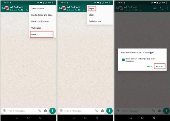 برای ریپورت مخاطب در واتساپ، وارد این پیام رسان شوید. سپس روی سربرگ Chats بزنید. حال وارد چت موردنظر شوید. سپس روی منوی سه نقطهای بزنید. از منوی باز شده گزینه More را انتخاب کنید. سپس روی Report بزنید. پیامی برایتان نمایان خواهد شد. روی Report بزنید. اگر میخواهید فرد را بلاک کنید و آن چت را هم حذف کنید، تیک Block contact and delete this chat’s messages را بزنید.