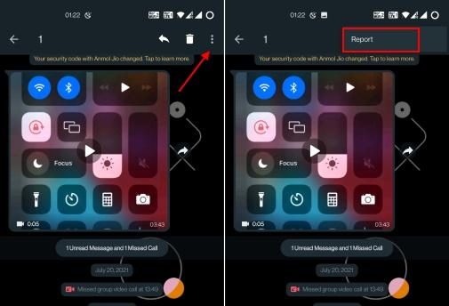 در نهایت روی منوی سه نقطهای که در بخش بالایی و راست قرار دارد بزنید. اکنون گزینه Report برای شما نمایش داده میشود. پیامی باز خواهد شد. در آن هم Report را انتخاب کنید. اگر میخواهید آن فرد را بلاک کنید، میتوانید تیک Block contact را هم بزنید. در حین ریپورت کردن آن پیام، میتوانید مخاطب را هم گزارش دهید. روی منوی سه نقطهای بزنید و Report contact name را انتخاب کنید.