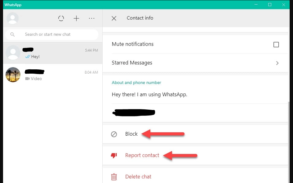 روش سوم این است که وارد چت شوید. سپس روی نام یا شماره مخاطب که در بالای صفحه قرار دارد، بزنید. حال در صفحه باز شده، برای بلاک کردن فرد روی Block بزنید و برای ریپورت کردن آن روی Report contact بزنید. نکته بسیار مهمی که باید به آن توجه داشته باشید این است که ریپورت کردن یک مخاطب، تنها ۵ پیام آخر وی توسط ناظران واتساپ بررسی میشود.