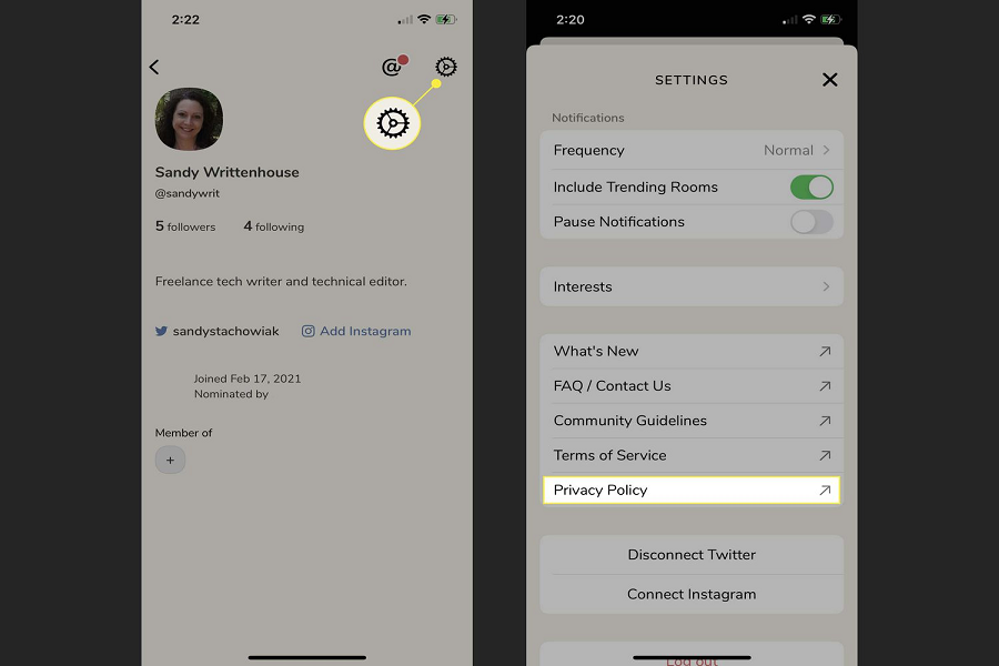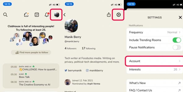به طور کلی دو روش طلایی برای حذف کامل و دیلیت اکانت کلاب هاوس وجود دارد که در این بخش قصد داریم به آنها بپردازیم. اولین روش دیلیت اکانت کلاب هاوس با استفاده از غیرفعالسازی حساب کاربری است. اپلیکیشن را باز کرده و از مراحل زیر پیروی کنید تا حساب کاربری کلاب هاوس خود را غیرفعال کنید.