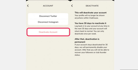 غیرفعال یا دی اکتیو کردن کلاب هاوس در واقع حساب شما را از دید عموم خارج میکند، اما برنامه همچنان تا 30 روز اطلاعات کاربری شما را حفظ میکند. در این مدت با ورود مجدد میتوانید حسابتان را دوباره فعال کنید، با این حال اگر پس از مهلت 30 روزه فعالیتی نداشته باشید کلاب هاوس حساب شما را از کار میاندازد؛ به این معنی که شما برای همیشه دسترسی به حساب خود و اطلاعات آن را از دست میدهید. حذف اکانت نیز به معنای حذف دائمی تمامی اطلاعات شما از سرورهای Clubhouse است و مشابه این است که شما از ابتدا در این برنامه هیچ اکانتی نداشتهاید.