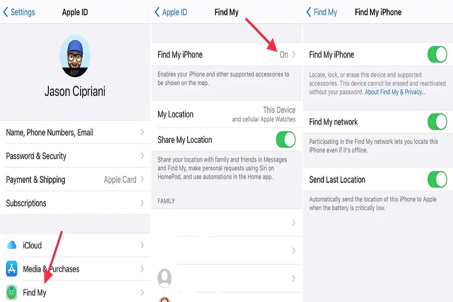 پس از تنظیم رمز عبور، دوباره بررسی کنید که Find My روشن باشد. البته این ویژگی باید به طور پیشفرض فعال باشد. در آیفون خود، به بخش Settings بروید و روی نامتان در بالای صفحه ضربه بزنید. در مرحله بعد، روی Find My > Find My iPhone ضربه بزنید. مطمئن شوید که گزینه Find My iPhone فعال است و حتما گزینههای Find My network و Send Last Location را نیز فعال کنید.