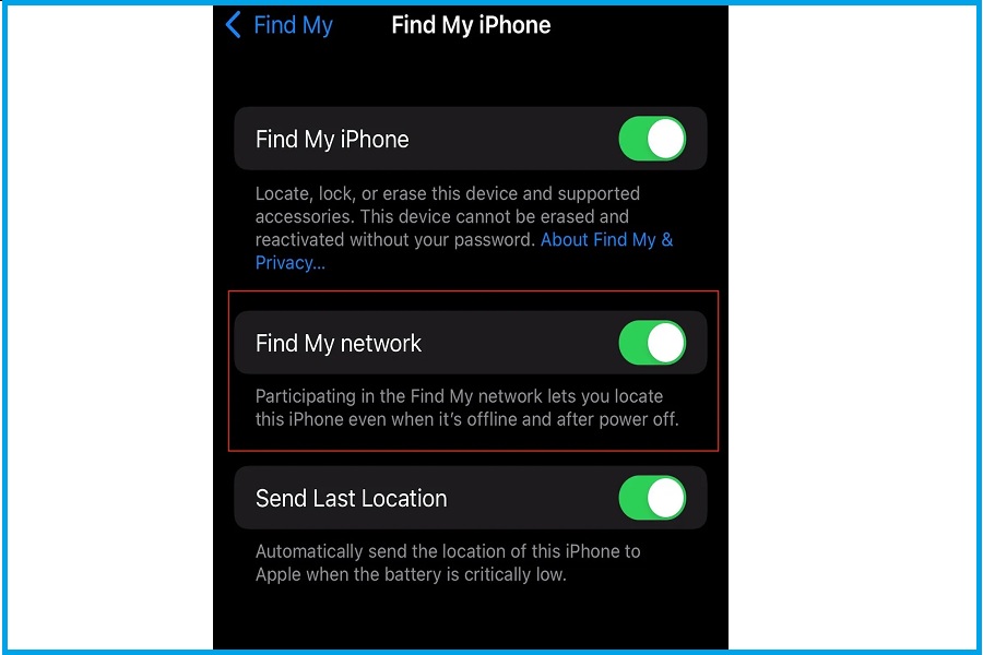 گزینه Send Last Location آخرین مکانی را که آیفون در دستتان بوده ثبت میکند. وقتی شارژ گوشی کم میشود، آخرین مکان آن بهطور خودکار به Find My ارسال میشود تا در صورت خاموش شدن بتوانید آن را پیدا کنید. اگر دستگاه شما از نسخه iOS 15 استفاده میکند، میتوانید گوشیتان را پس از خاموش شدن هم پیدا کنید. البته این ویژگی فقط در مدلهای جدیدتر آیفون در دسترس است.