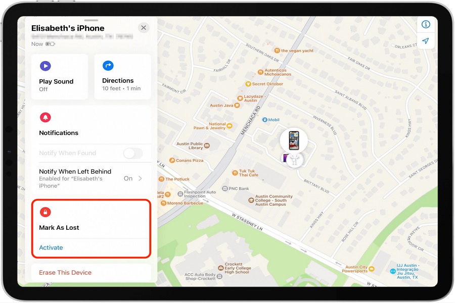 هنگام مشاهده مکان دستگاه، با استفاده از گزینه موجود در گوشه سمت راست بالای صفحه، میتوانید صدا پخش کنید، گزینه Lost Mode را روشن کنید و یا اینکه اطلاعات آیفونتان را از راه دور پاک کنید. همین گزینهها را میتوانید در برنامه Find My و با اسکرول کردن بهسمت پایین پیدا کنید، ضمن اینکه یک گزینه دیگر نیز در آنجا وجود دارد و آن اینکه در صورت آفلاین شدن دستگاه، هر وقت که دستگاه پیدا شد، این امکان وجود دارد که یک پیام برای شما ارسال شود.