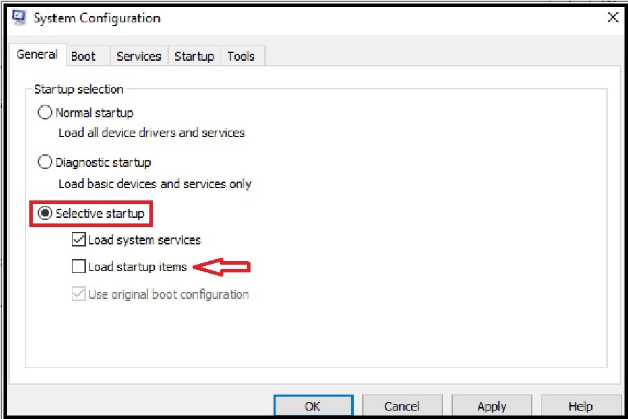 در صفحه باز شده ابتدا تیک گزینه Selective startup را روشن کرده و بعد تیک گزینه Load startup item را حذف کنید. سپس وارد سربرگ Services شوید و تیک گزینه Hide all Microsoft services را روشن کنید. اکنون روی گزینه Disable all کلیک کرده و دکمه OK را بزنید.