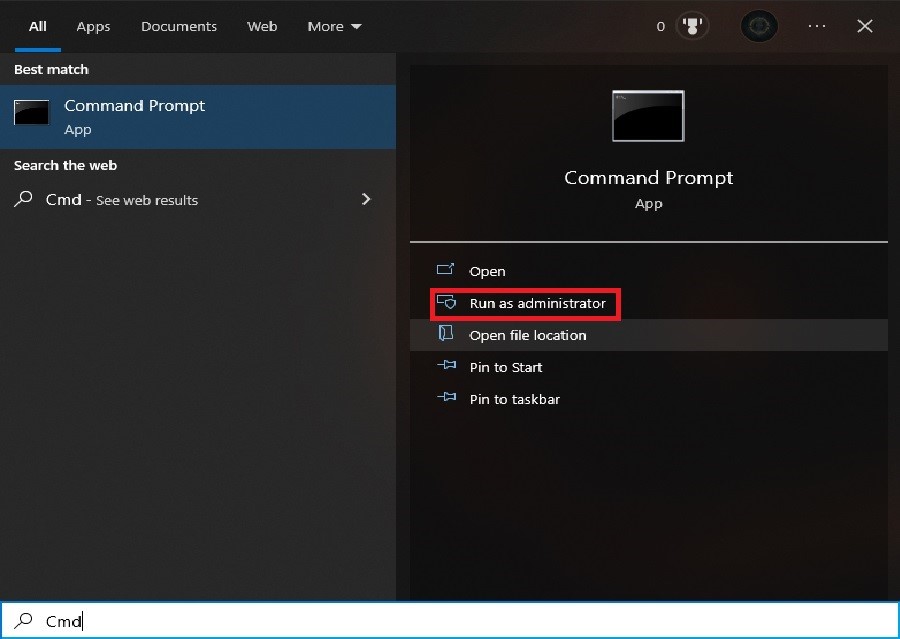 برای حل ارور Has Stopped Working از طریق عیبیابی فایلهای سیستمی ابتدا باید در قسمت سرچ ویندوز عبارت Cmd را جستجو کنید. در میان گزینههای پیشنهاد شده، cmd.exe یا همان command prompt را انتخاب نمایید. سپس روی آن کلیک راست کرده و در میان گزینههای ظاهر شده، Run as administrator را اجرا کنید.