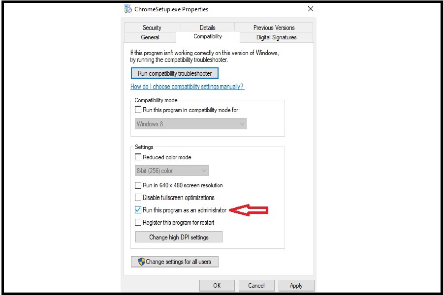 اکنون در پنجره باز شده تب Compatibility را انتخاب کرده و تیک گزینه Run this program as an administrator را روشن کنید. سپس گزینه OK را بزنید تا تغییرات اعمال شده ذخیره شوند. به این ترتیب برنامه یا بازی مورد نظر شما در حالت ادمین اجرا خواهد شد.