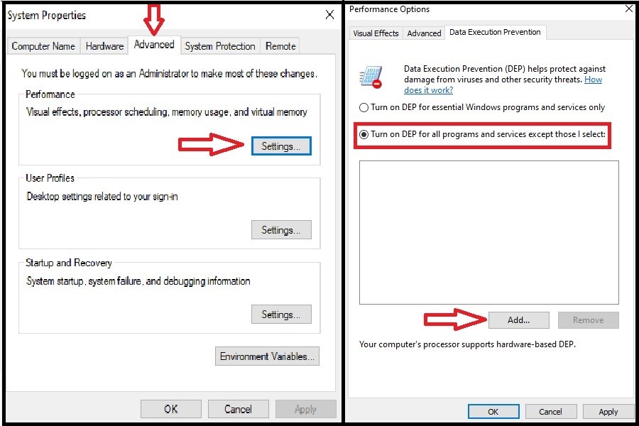 در سربرگ Advanced پنجره جدید، بخشی به نام Performance وجود دارد که دارای یک گزینه Settings است. روی این گزینه کلیک کرده و در پنجره جدید وارد سربرگ DataExecution Prevention شوید. سپس تیک گزینه Turn on DEP for all programs and services except those I select را روشن کرده و گزینه Add را بزنید.