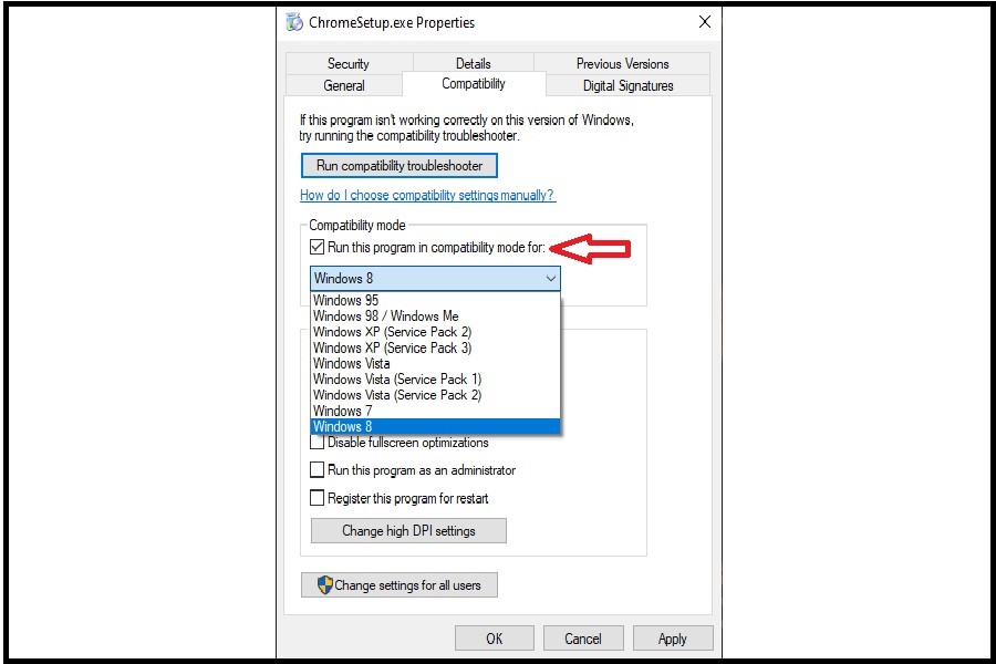 به این ترتیب لیست کشویی زیر این گزینه در دسترس قرار میگیرد. در این لیست، ویندوز سازگار با برنامه مورد نظر را انتخاب کرده و در نهایت OK را بزنید تا تغییرات اعمال شده ذخیره شوند. با انجام این فرایند برنامه مورد نظر شما با ویندوز سازگار شده و بدون ظاهر شدن خطای توقف، اجرا خواهد شد.