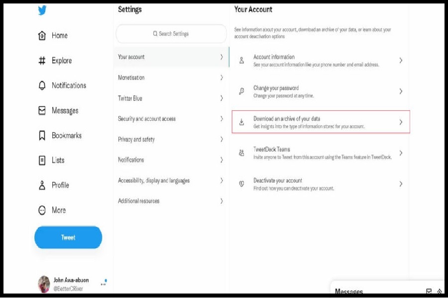 برای دانلود اطلاعات خود، پیش از حذف حساب کاربریتان، باید پس از ورود به سایت توییتر به حساب خود وارد شوید. پس از آن با کلیک بر روی گزینه More از منوی بازشده بر روی گزینه Settings and privacy کلیک کنید. سپس باید با رفتن به داخل تب Your Account گزینه Settings and support را انتخاب کرد. در انتها با انتخاب Request Archive از بخش Settings and Privacy اطلاعات شما دانلود میشود. در صورت صحیح انجامدادن مراحل، بعد از مدت کوتاهی با ارسال ایمیلی حاوی اطلاعات حساب کاربریتان این مرحله پایان مییابد.