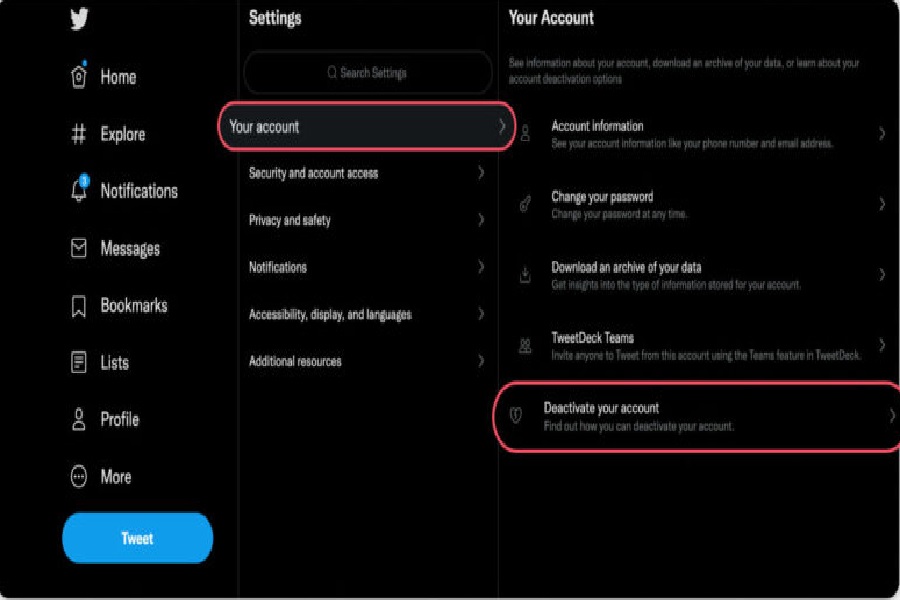 - برای ورود به صفحه تنظیمات توییتر، در مرحله بعد روی گزینه Settings and privacy کلیک کرده و از داخل صفحه تنظیمات با انتخاب بخش Your account روی گزینه Deactivate your account را انتخاب کنید