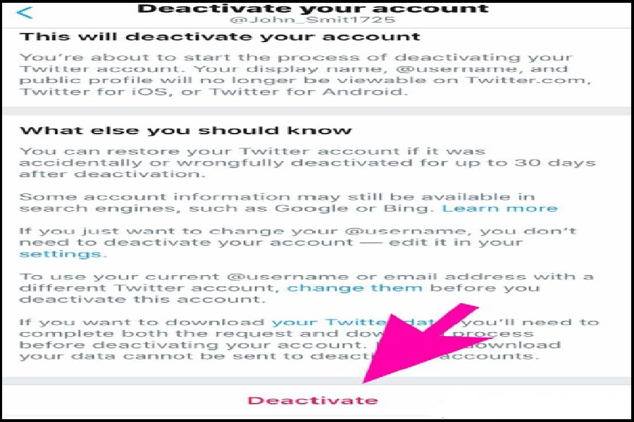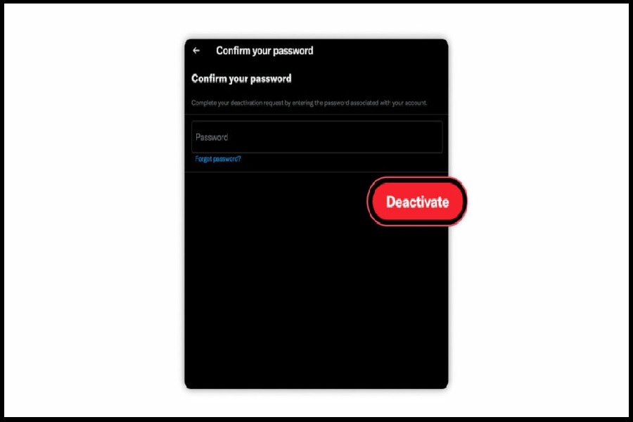 - مرحله بعدی در نحوه دیلیت اکانت توییتر، مشاهده شرایط غیر فعال کردن و حذف اکانت این اپلیکیشن است. برای تایید آنها باید روی گزینه Deactive کلیک کنید. پس از تایید آن به صفحه Confirm your password هدایت میشوید که باید رمز عبور حساب کاربری خود را در کادر مربوطه وارد کرده تا دوباره گزینه Deactive انتخاب شود