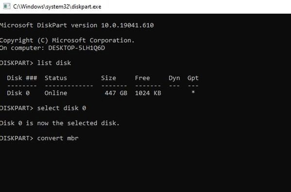 با نگارش عبارت list disk، هارددیسک و درایوهای سیستم برای شما نمایش داده خواهد شد. اگر تنها یک هارد درایو داشته باشید، عبارت disk 0 برای شما نمایش داده خواهد شد. در جدولی که جلوی نام هارد قرار دارد، نام دو عبارت dyn و GPT دیده میشود. اگر نام ستاره زیر جی پی تی وجود داشت، به این معنی است که هارد شما از این نوع میباشد.