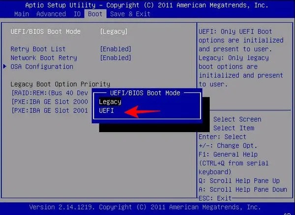 به طور کلی، در سیستمهای بایوس امکان اجرای دیسک GPT وجود ندارد. به همین خاطر، باید تنظیمات بایوس را روی UEFI قرار دهید. برای این منظور، باید زمانی که کامپیوتر خود را روشن میکنید، وارد تنظیمات بایوس خود شوید. در ادامه، باید وارد بخش BOOT شوید و تنظیمات حالت بوت را روی UEFI قرار دهید. برای این منظور، میتوان از کلیدهای کیبورد استفاده کرد. بعد از ذخیره تنظیمات و خروج، میتوانید وارد حالت بوت UEFI شوید و از طریق آن نصب ویندوز را انجام دهید.