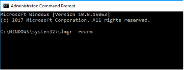 در پنجره Command prompt، دستور slmgr –rearm را تایپ کنید و کلید Enter را فشار دهید.