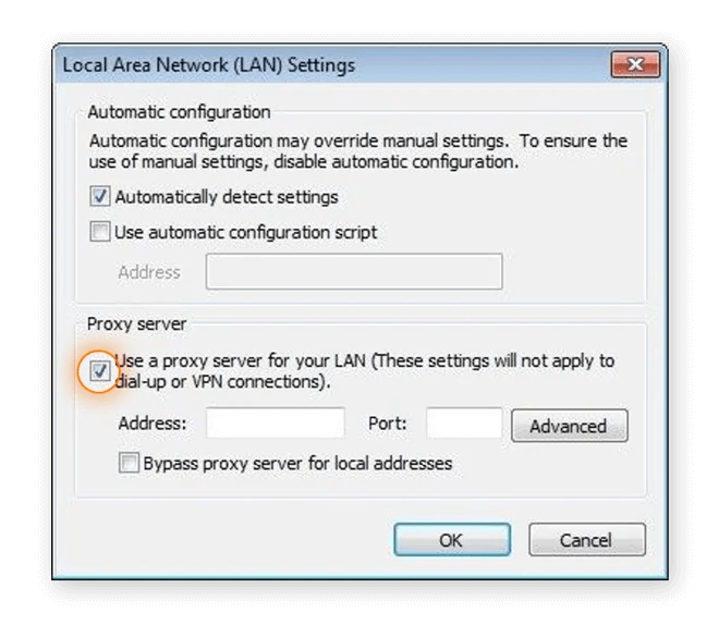 - در پنجره Local Area Network (LAN) Settings، گزینه "Use a proxy server for your LAN" را بدون علامت کنید.
