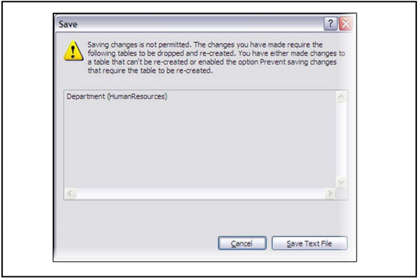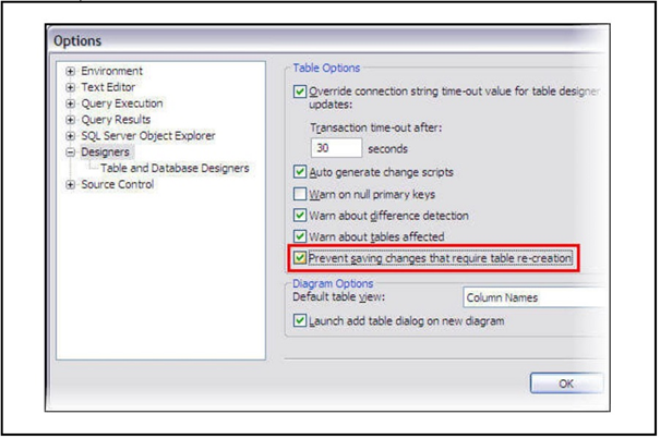شما میتوانید با برخی روشها گزینه Prevent saving changes that require the table re-creation را تغییر دهید. باید توجه داشته باشید که با این کار دیگر درباره تغییر در ساختار ابرداده به شما هشدار داده نمیشود و ممکن است اطلاعات جدول را پس از ذخیره ناخواسته از دست دهید.