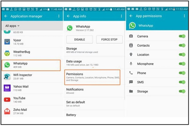 برای این کار در به تنظیمات بروید سپس به قسمت مدیریت برنامه ها یا Apps بروید و Whastapp را انتخاب کنید تا وارد بخش App Info شوید. در این بخش با انتخاب گزینه مجوزها میتوان اجازه دسترسی به مخاطبین را بررسی کرد.