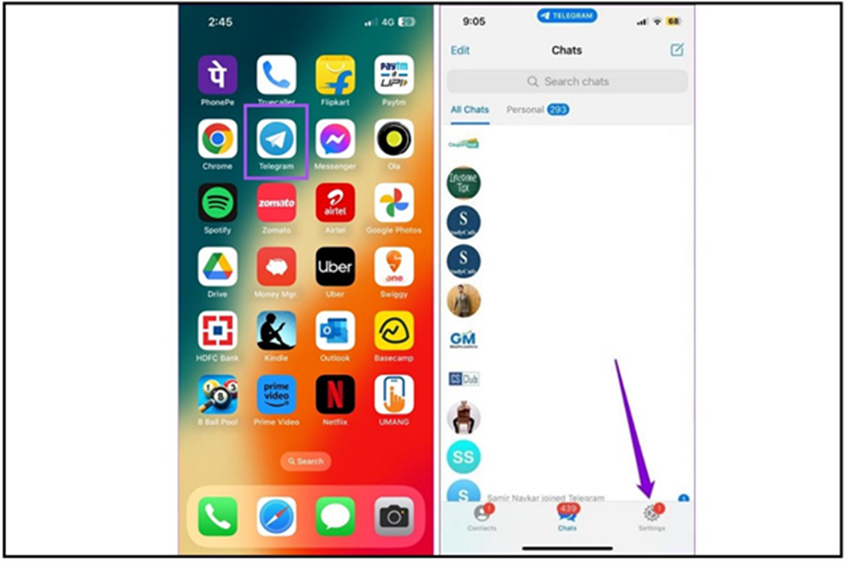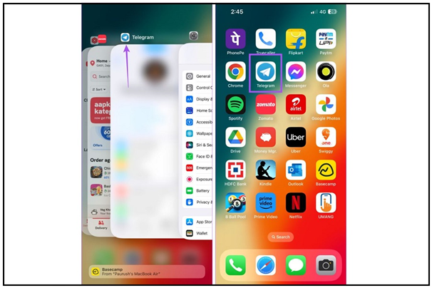 یکی از راهحلهای ساده و کارآمد برای حل خطای همگام سازی مخاطبین توقف اجباری تلگرام و ورود دوباره به آن در آیفون و اندروید است. اگر گوشی آیفون دارید در صفحه اصلی انگشت خود را به سمت بالا بکشید تا پنجره برنامهها ظاهر شود. در ادامه تلگرام را پیدا کنید و آن را حذف کنید. در پایان تلگرام را باز کنید و رفع ایراد آن را جویا شوید.
